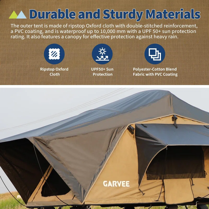• All-Weather Protection: Built for 4-season use, this roof top tent features double-stitched Oxford outer fabric, a polyester-cotton interior with 10,000mm waterproof rating and UPF 50+ UV shield. Full PVC coating keeps your truck rooftop tent protected.